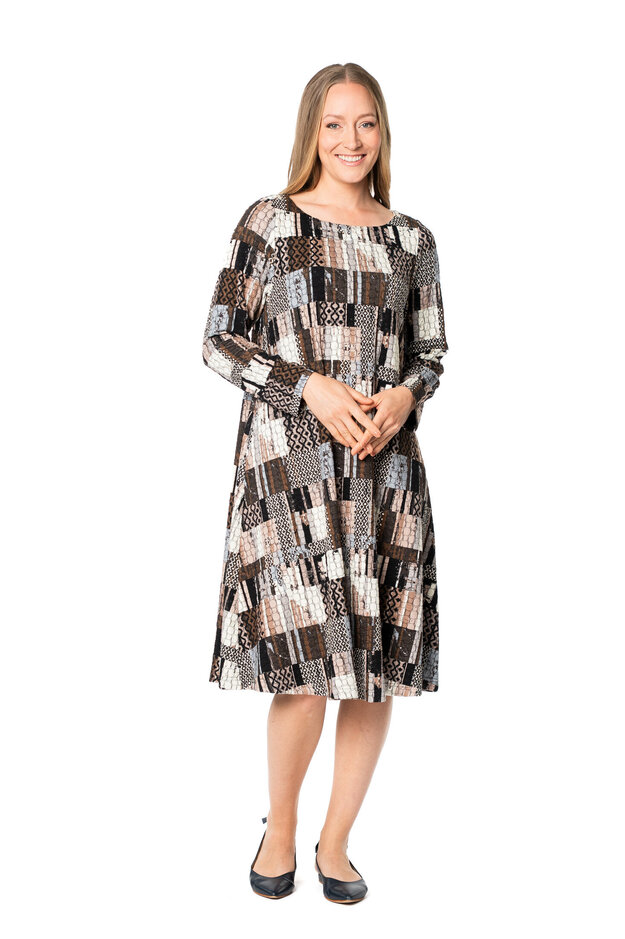 The Fioresa dress has a beautiful shape: fitted top and a slightly bell-shaped hem. The dress has a rounded boat neckline and long sleeves. Side pockets on both sides. A bold, comfortable and practical dress!