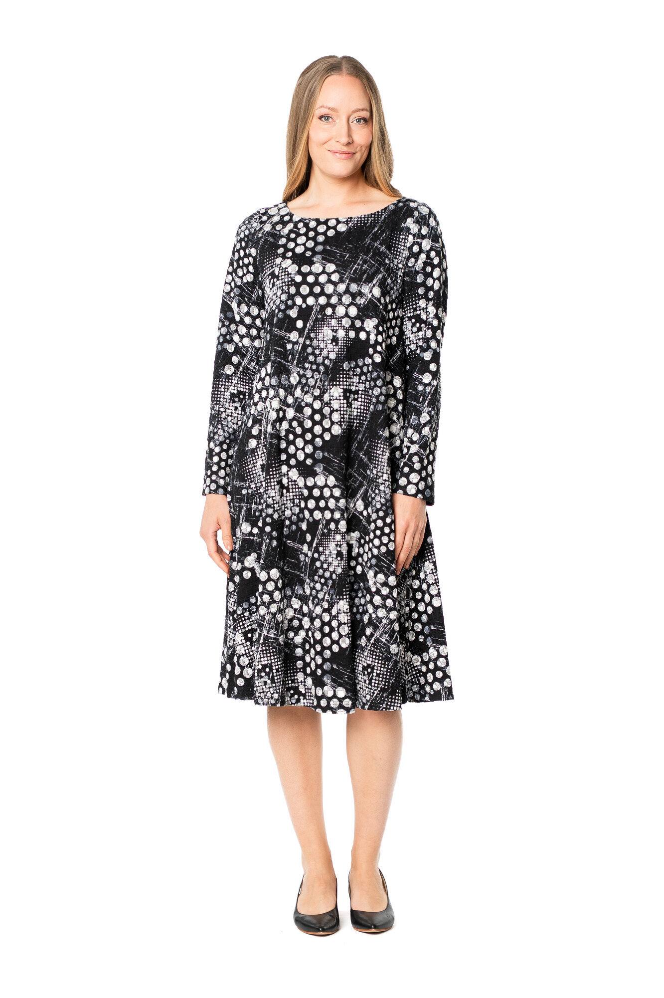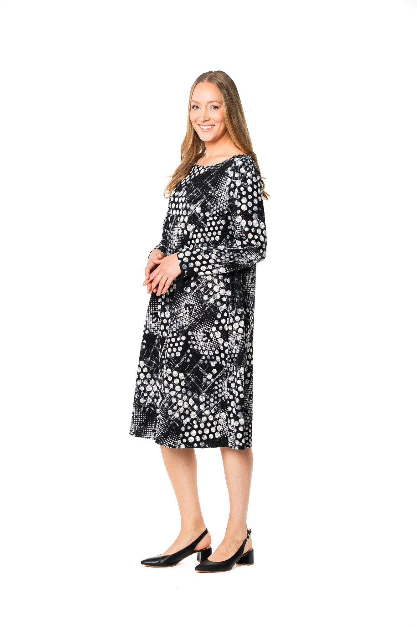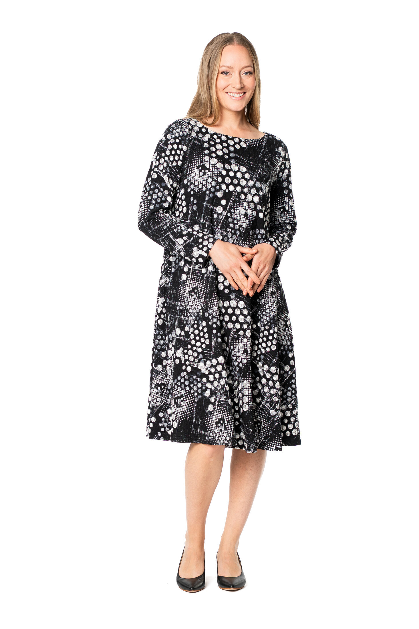 The Fioresa dress has a beautiful shape: fitted top and a slightly bell-shaped hem. The dress has a rounded boat neckline and long sleeves. Side pockets on both sides. A bold, comfortable and practical dress!