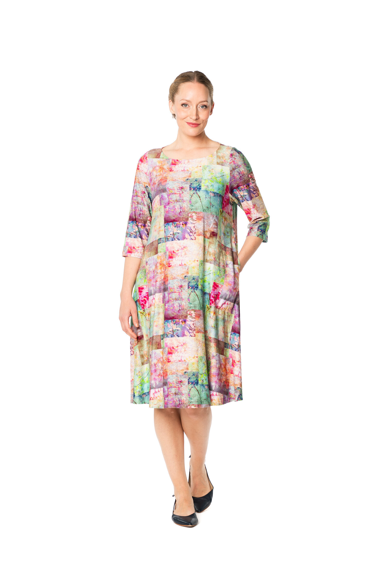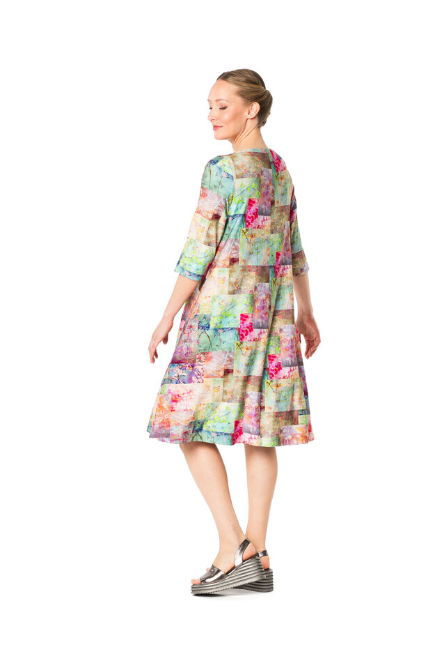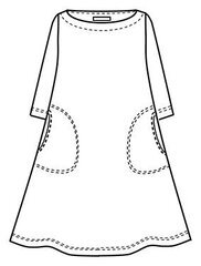 The Fiorina dress has a beautiful shape: fitted top and a slightly bell-shaped hem. The dress has a rounded boat neckline and ¾ length sleeves. It also has side pockets on both sides. The material is a pleasantly soft and drapey viscose jersey.