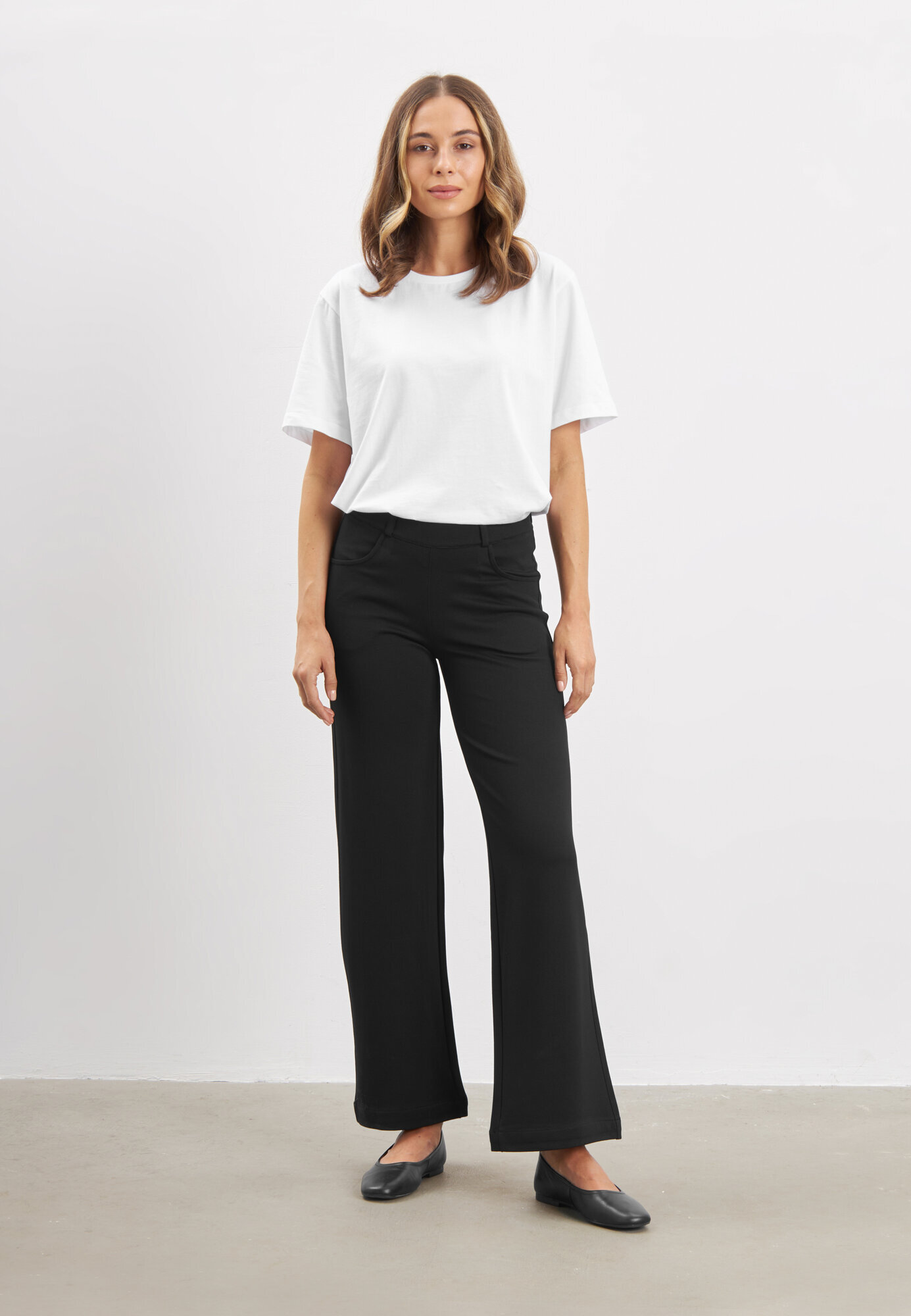Donna Loose brushed trousers are made from a soft and heavy EcoVero viscose blend. The loose silhouette is loose from the hip and down through the leg. The high degree of stretch to the fabric means that you can go one size smaller. The trousers have front pockets. Donna SL trousers have a short leg length, inseam length about 75-77cm. Fabric has a good colourfast.