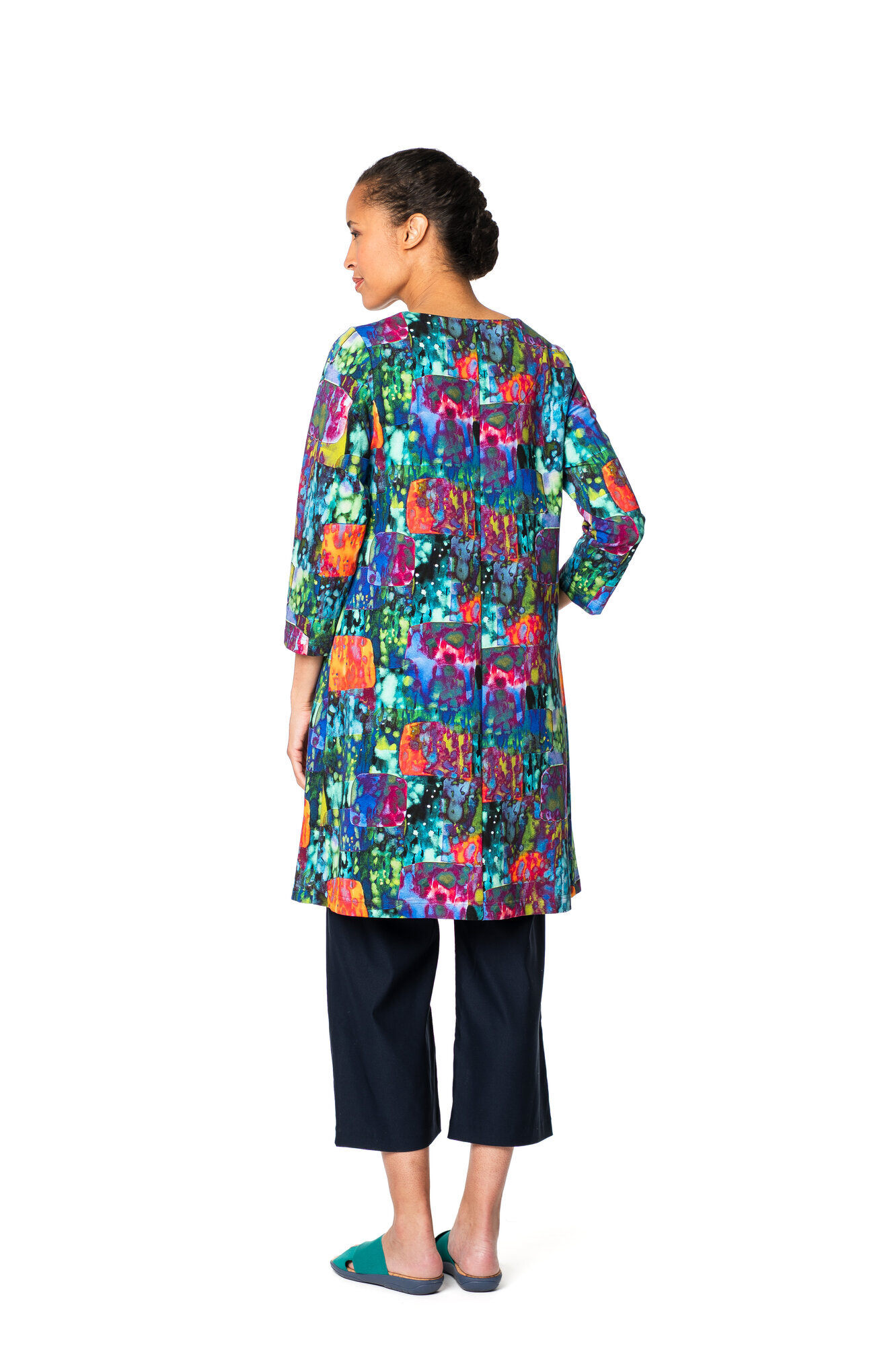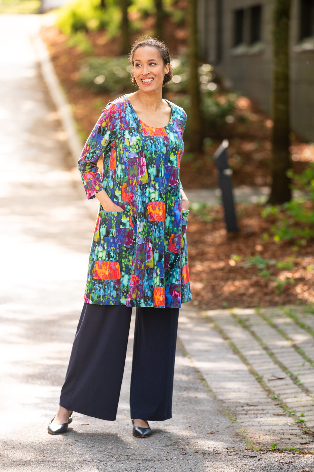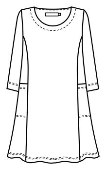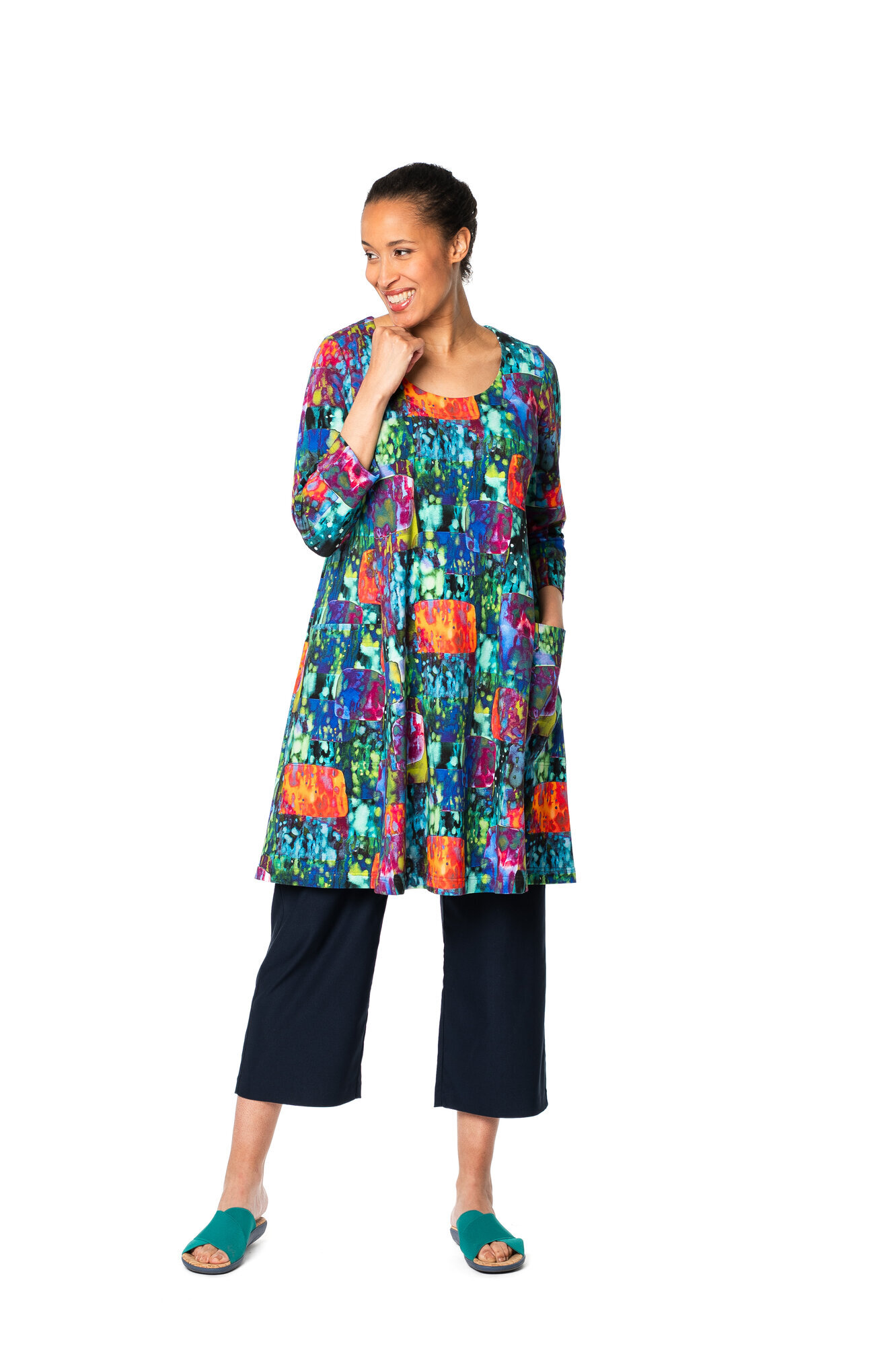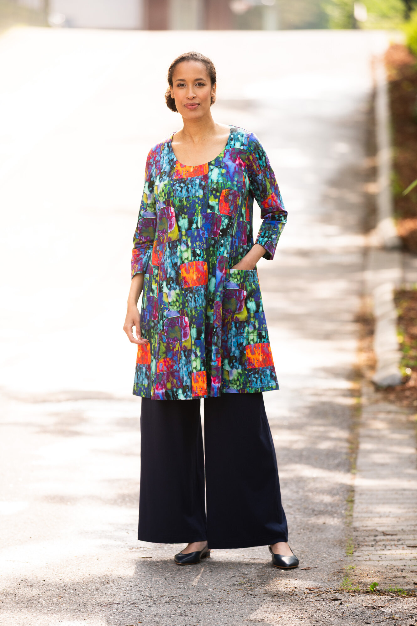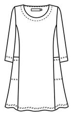 The long Diana tunic features a fitted top and a flared hem. It also has a round neckline and ¾ length sleeves, as well as big patch pockets on both sides. Diana can also be worn as a dress, depending on the wearer's height. The material is firm cotton jersey.