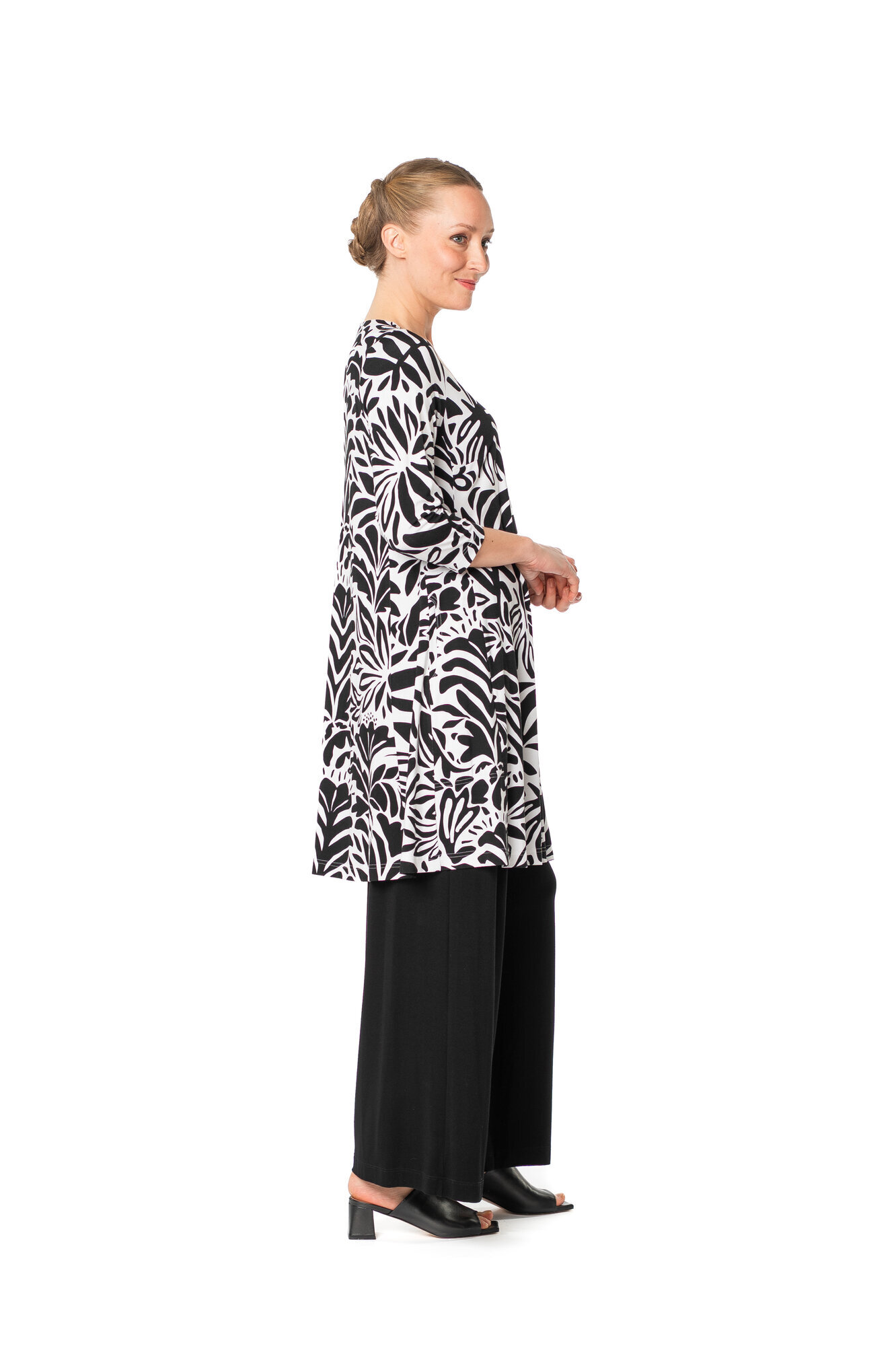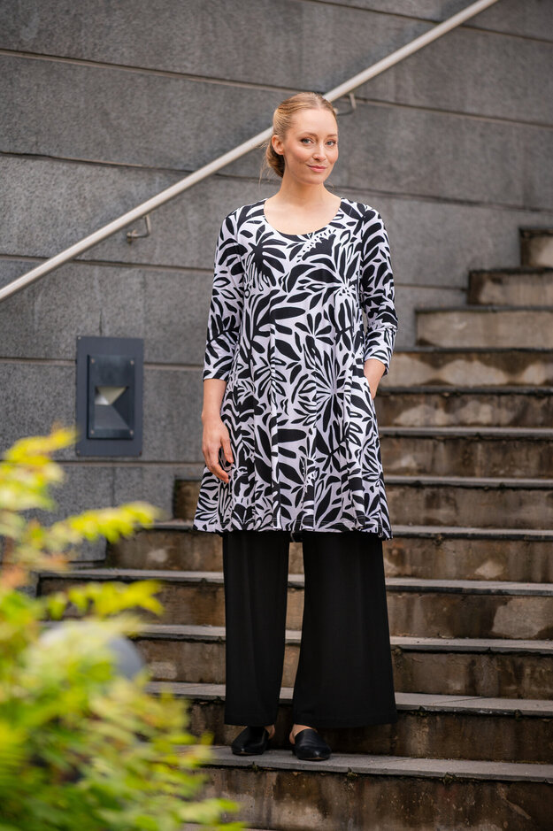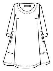 The long Jemina tunic features a close-fitting top with a wide hem, a round neckline and long sleeves. It also has large side pockets. Jemina can also be worn as a dress, depending on the wearer's height.
