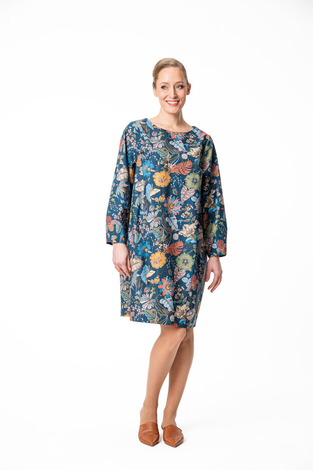 Grace -kangasmekossa on reilu mitoitus, laskettu olkalinja ja pitkät pyöristyvät hihat. Gracen helmassa ja hihansuissa on muotolaskokset tuomassa hieman pallomaista muotoa. Sivusaumoissa on kätevät taskut.