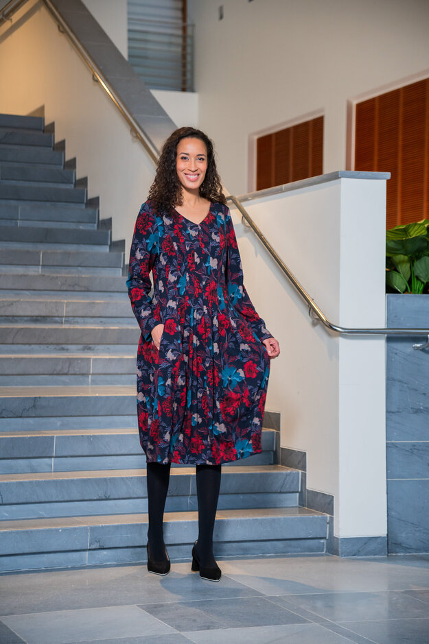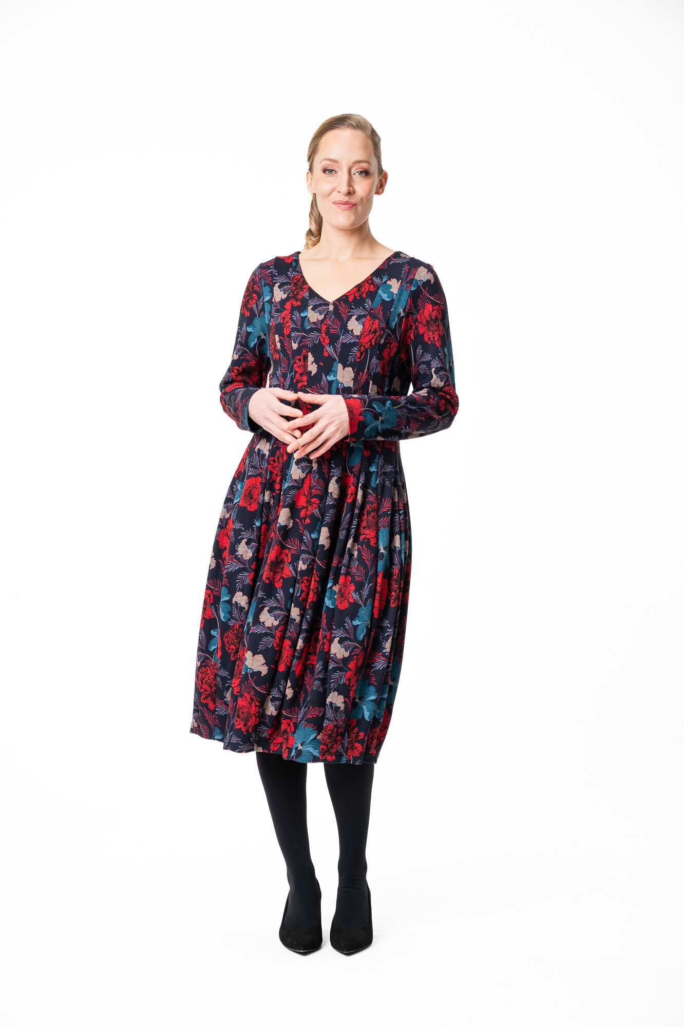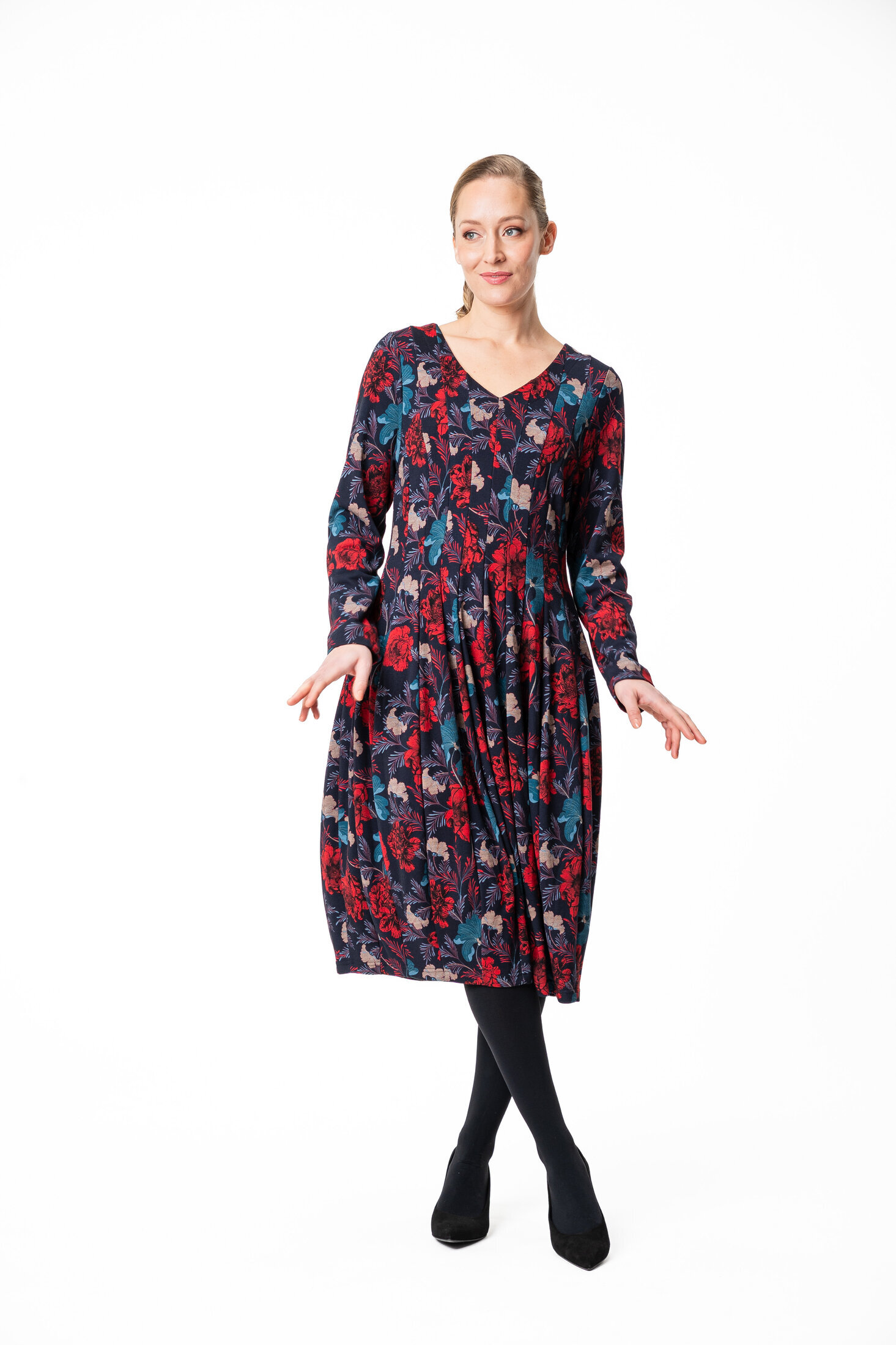 Nadette mekkossa on näyttävä, mielenkiintoinen siluetti. Mekko on istuva yläosasta ja yötäröltä, sen helma on tulppaanin muotoinen ja siinä on pitkät hihat. Mekko sopii hyvin juhlavampaankin talven tilaisuuteen.