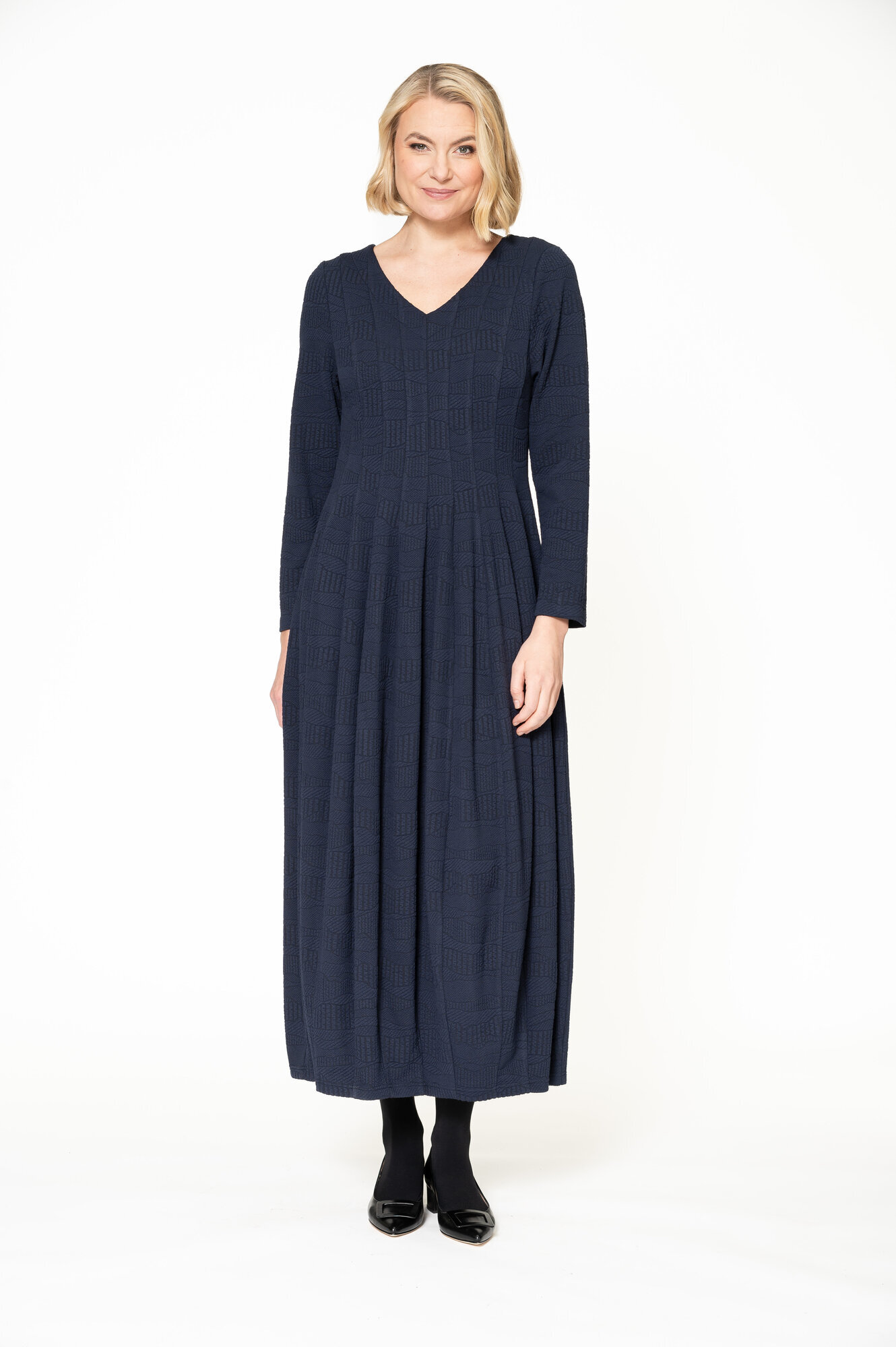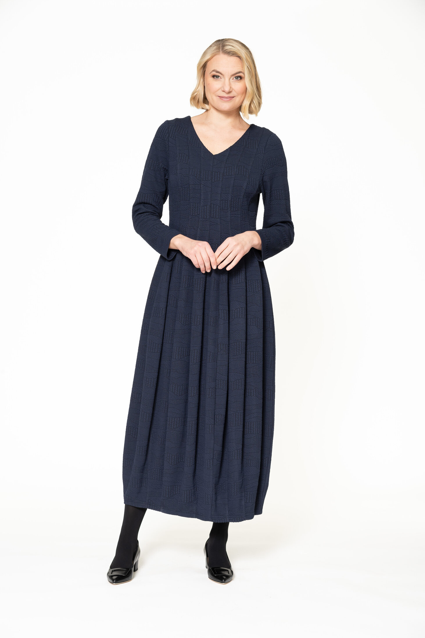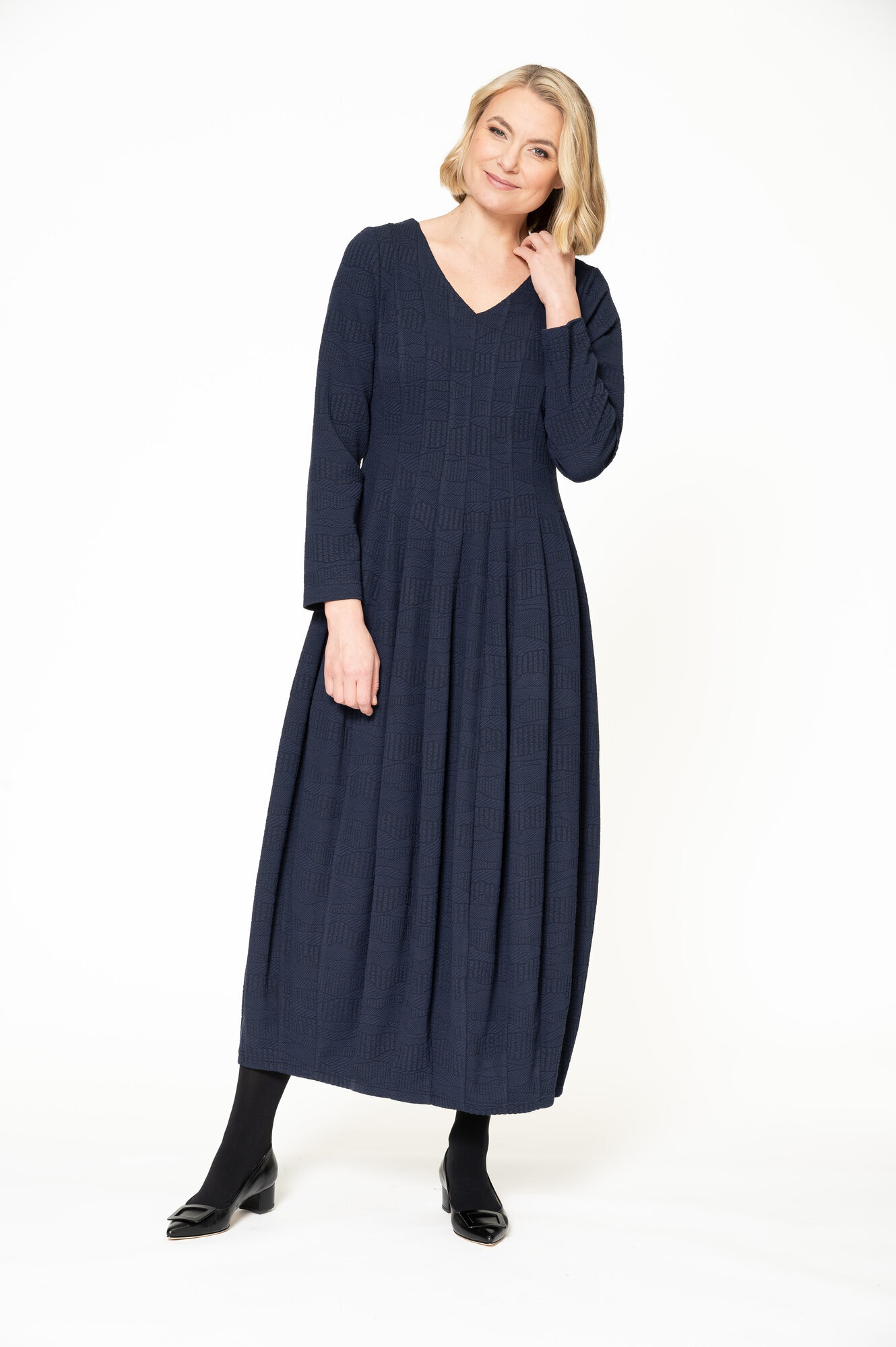 Pinnan kohokuviointi tuo juhlavuutta tähän miellyttävään viskoosisekoiteneulokseen.