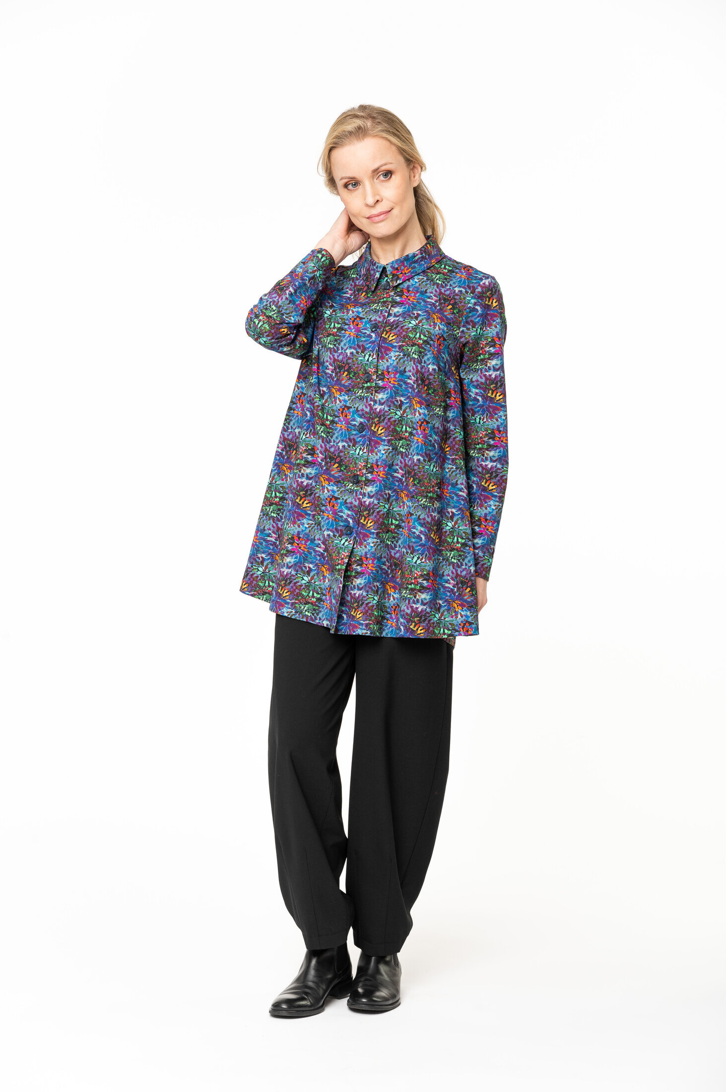 Margo on rento, A-linjainen napitettu jakku. Jakussa on pitkät hihat, pukeva kaulus ja sivusaumataskut.