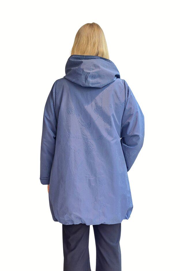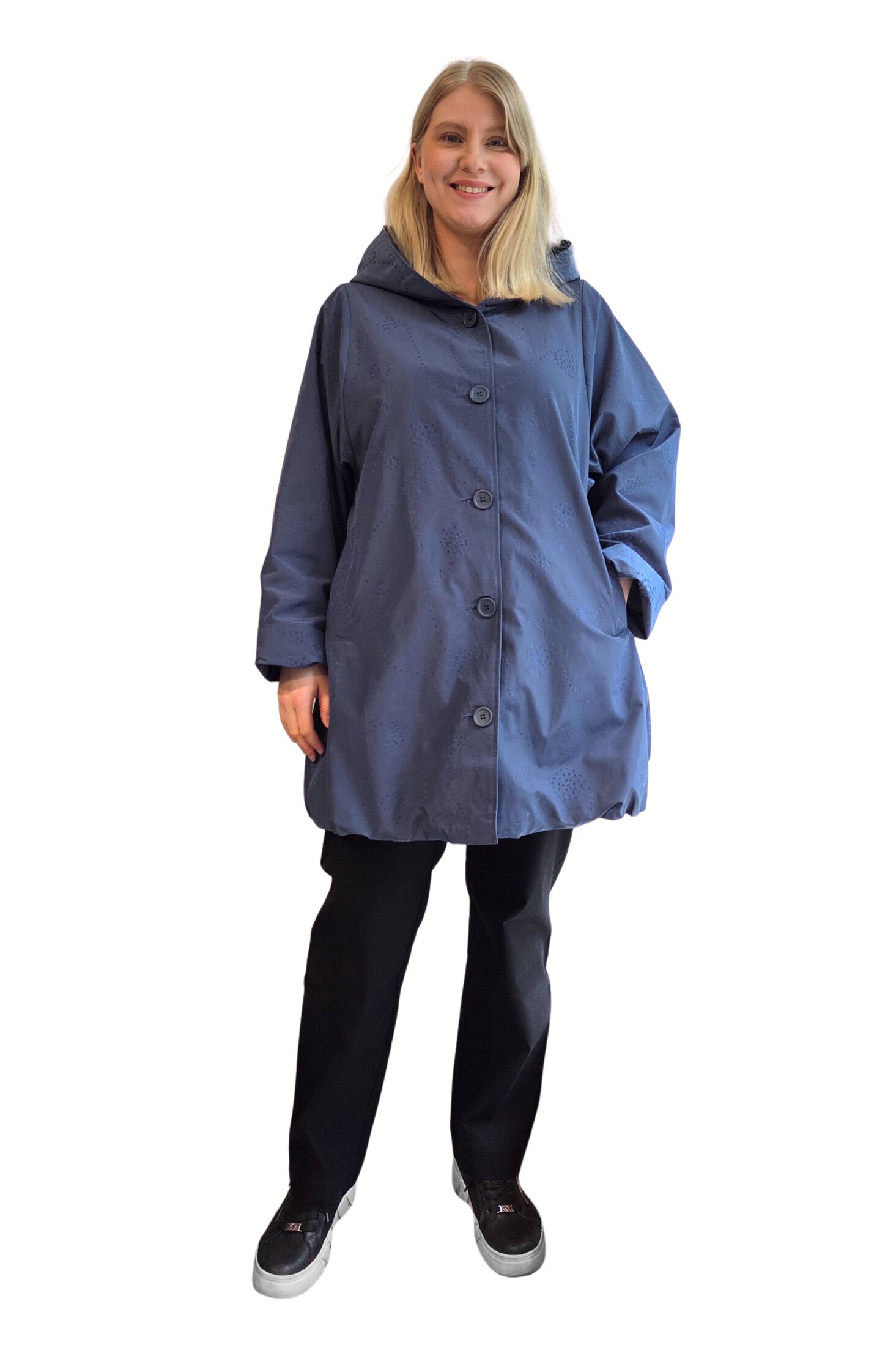 Hupullinen Carmen -takki on väljä mitoitukseltaan. Takin helmassa on kuminauha, jonka ansiosta helma on kauniisti aavistuksen pussimainen. Takissa on reilu kädentie ja hihat, joita voi kääntää lyhyemmiksi – hihansuiden leveä alavara mahdollistaa kääntämisen. Takissa on nappikiinnitys, suuret taskut ja povitaskukin löytyy vuoritetun takin sisäpuolelta. Takki on vettähylkivyyskäsitelty. Takin pinnassa on pistemäinen samettipainatus sävy sävyyn pohjavärin kanssa.