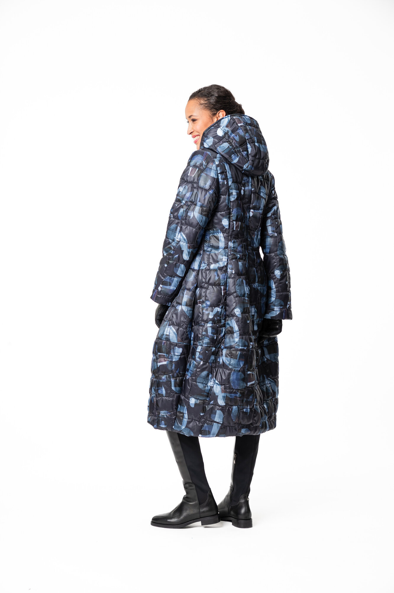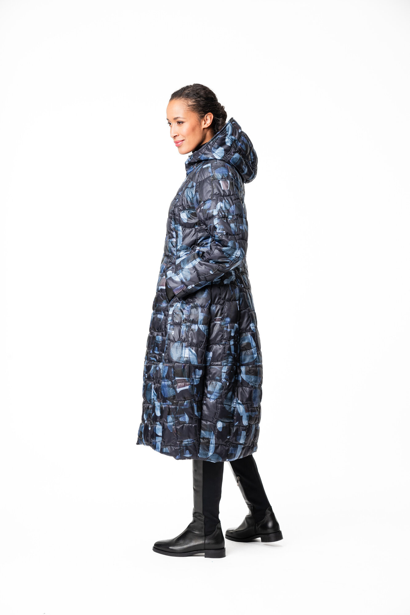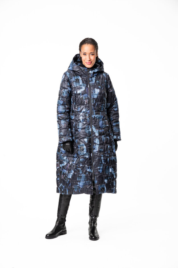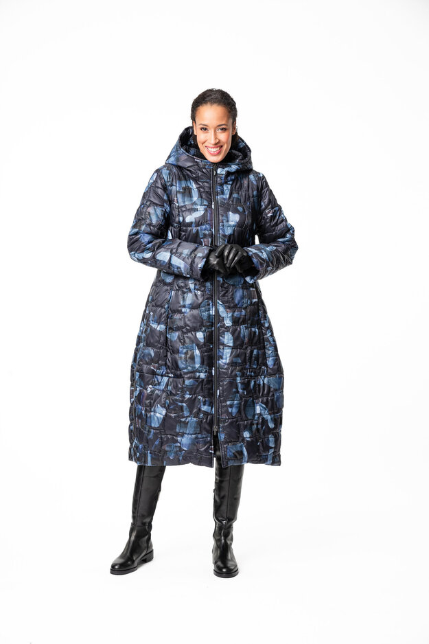 Tikatussa pitkässä Miranda -toppatakissa on istuva yläosa ja hauska pallomainen helma. Takissa on kahteen suuntaan avattava vetoketju, pystytaskut ja huppu. Takkien taskuissa käytämme tukevaa puuvillakangasta joka pitää taskun ryhdin ja on kestävä käytössä. Myös povitasku löytyy takin sisäpuolella. Vuori on 100% viskoositwilliä. Takin päällyskangas on käsitelty vettähylkiväksi ja siinä on kevytvanu sisällä.