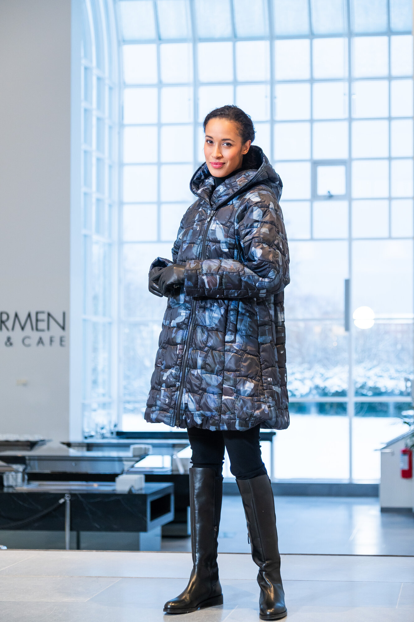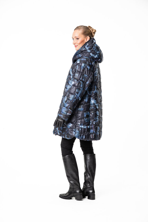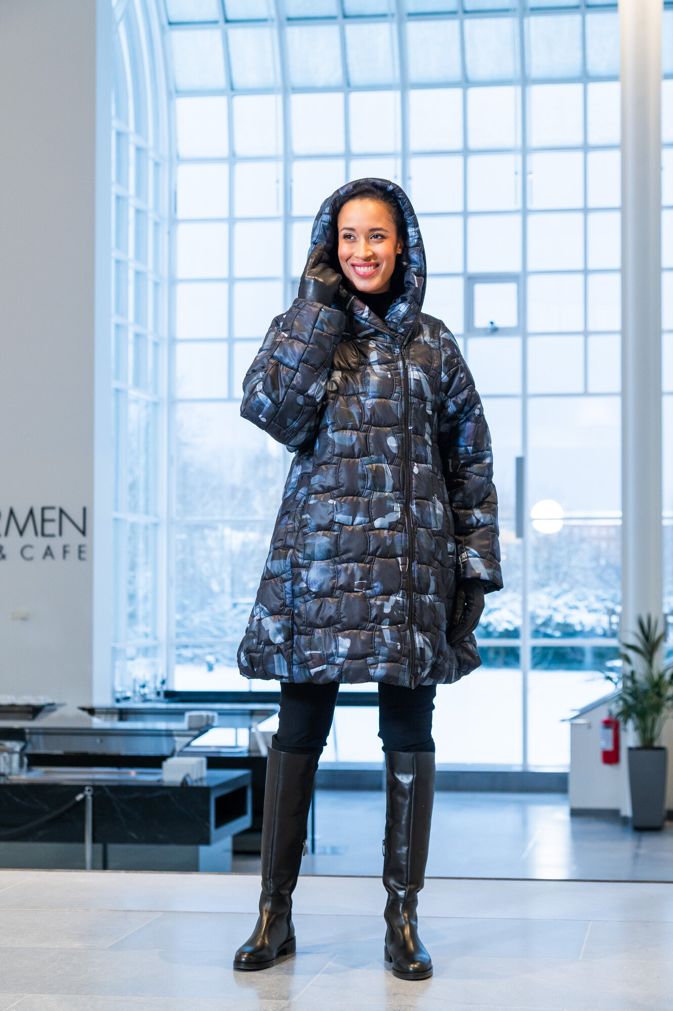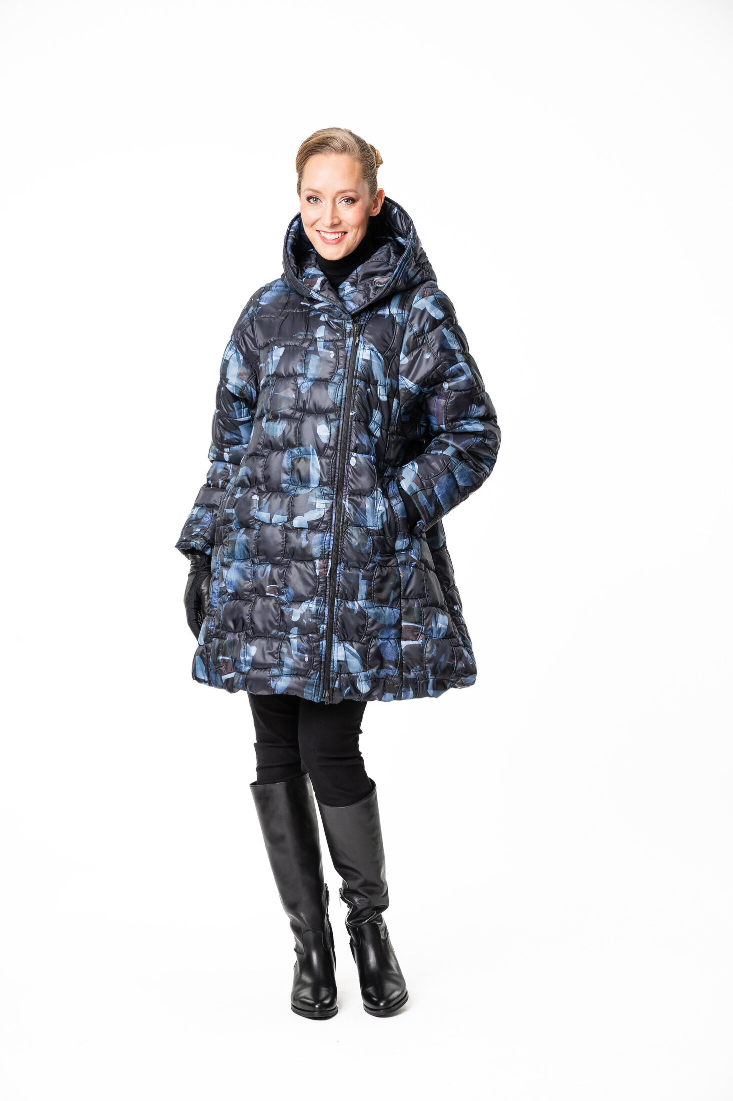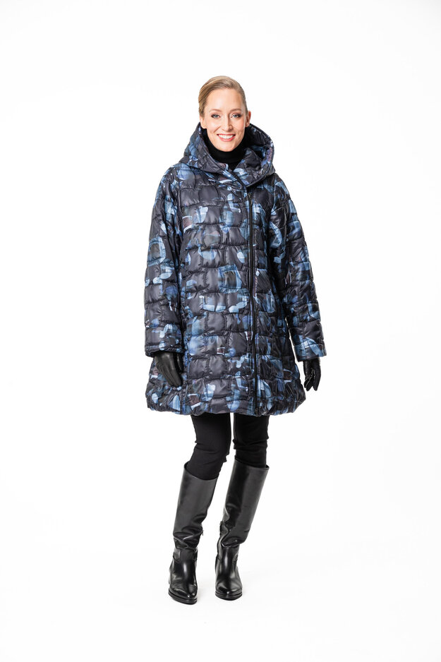 Penina -toppatakin hieman A-linjainen malli on suunniteltu sopimaan monenlaisille vartalotyypeille ja sen mitoitus onkin reiluhko. Takin helmassa on molemmin puolin kiristysnyöri, jolla helman leveyttä voi säätää, jolloin takin malli muuttuu A-linjaisesta suoremmaksi. Takissa on väljät hihat ja leveät hihansuut. Hihansuissa olevat piiloresorit pitävät kylmän loitolla. Suuri huppu suojaa tuiskulta. Takissa on kahteen suuntaan avattava vetoketju, vinot taskut edessä. Takkien taskuissa käytämme tukevaa puuvillakangasta joka pitää taskun ryhdin ja on kestävä käytössä. Myös povitasku löytyy takin sisäpuolella. Vuori on 100% viskoositwilliä. Takin päällyskangas on käsitelty vettähylkiväksi ja siinä on kevyt vanu.