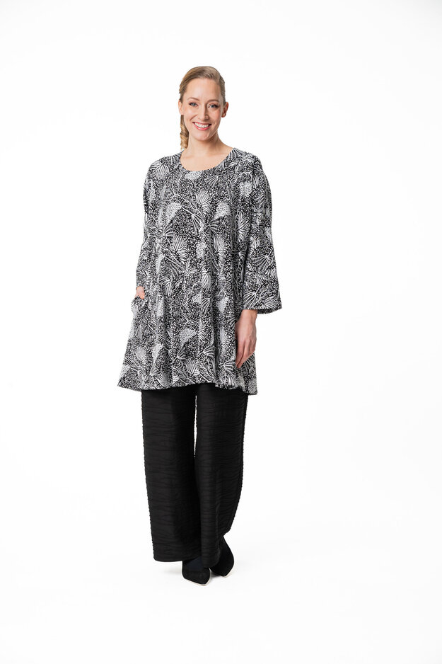 Bianca -tunikassa on reilu mitoitus ja kellomainen helma. Tunikassa on leveät kimonomalliset hihat ja pyöreä pääntie. Sivusaumoissa on kätevät taskut.