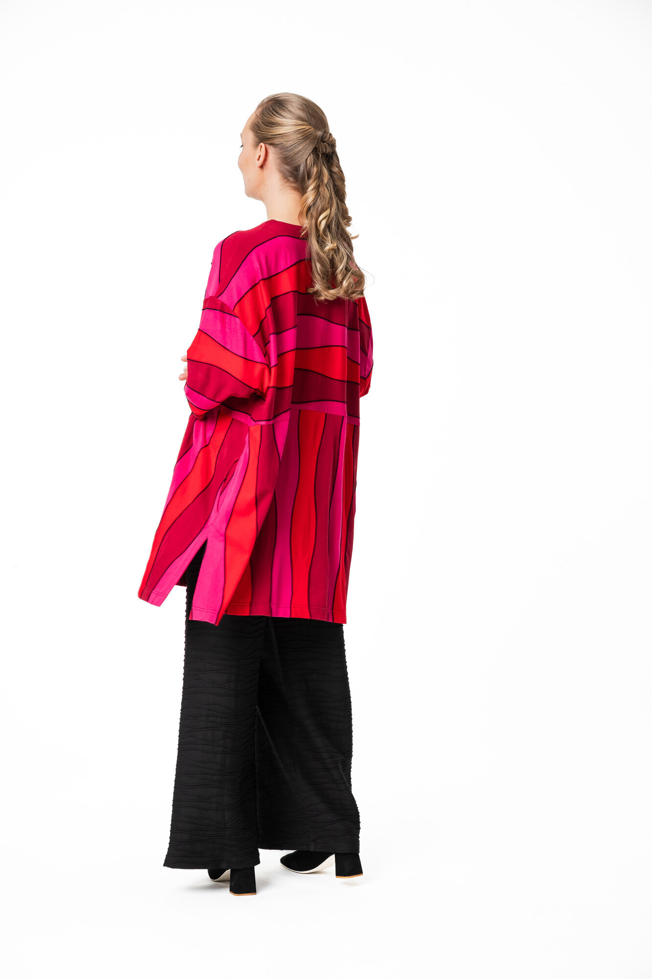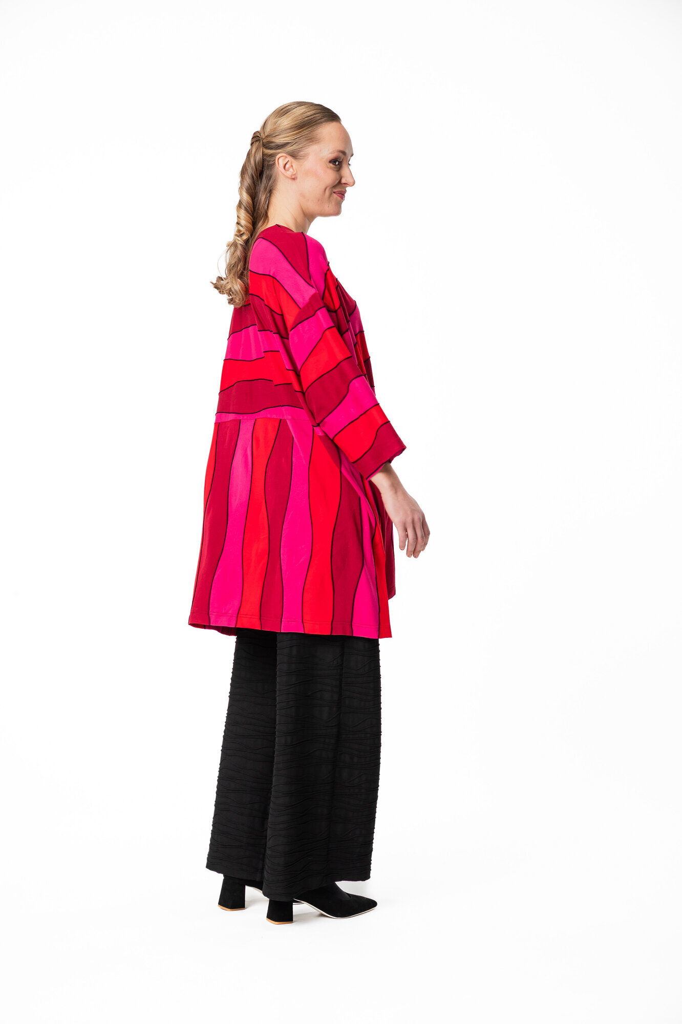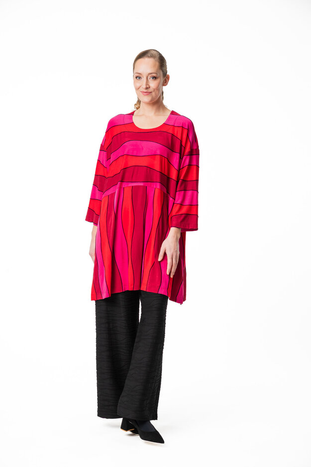 Desmona tunikassa on erittäin reilu ja rento mitoitus, laskettu olkalinja ja leveät 3/4 mittaiset hihat. Pääntie on pyöreä. Tunikan helmassa on väljyyttä tuovat halkiot molemmissa sivuissa. Sivusaumataskut.