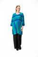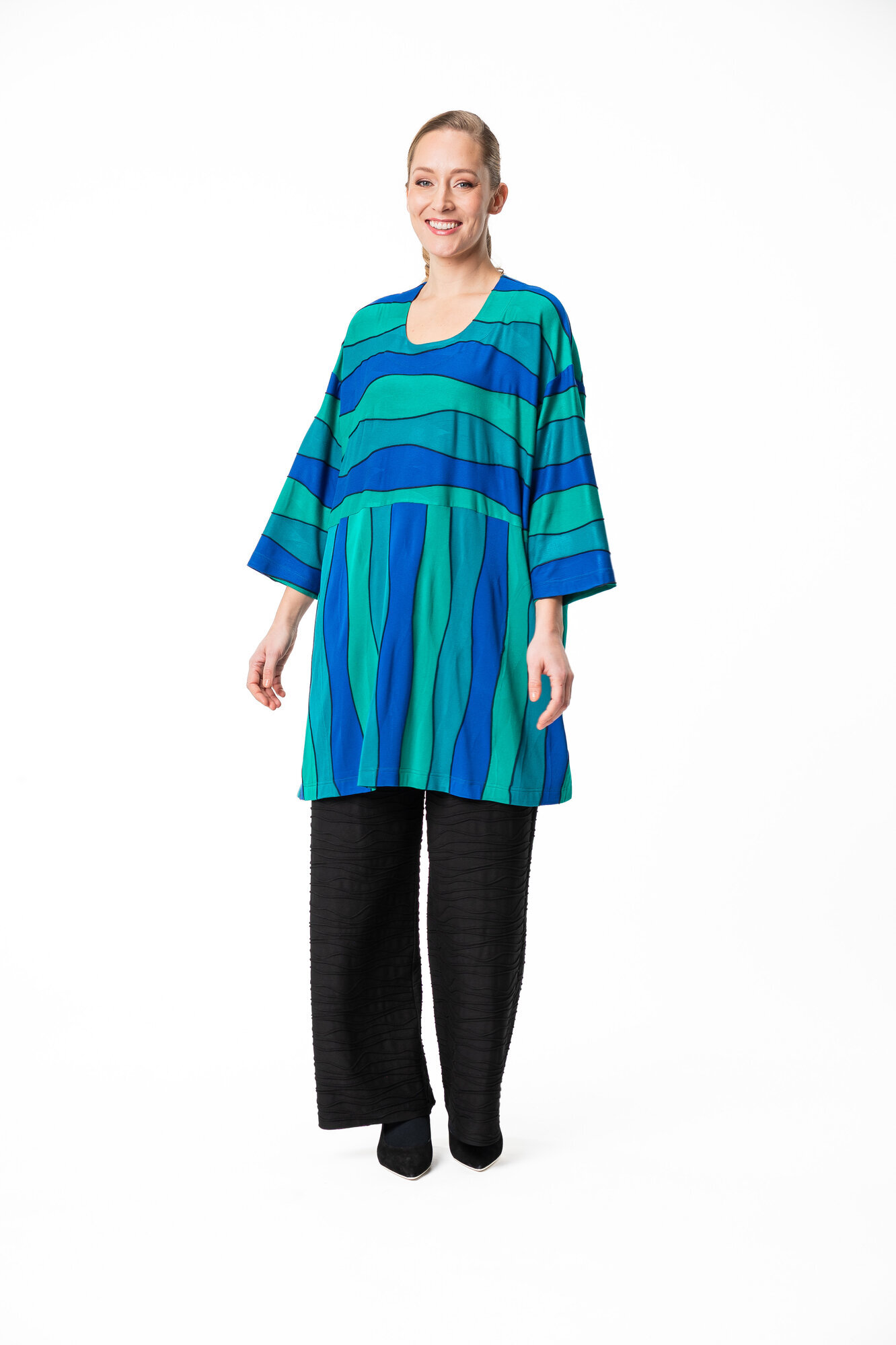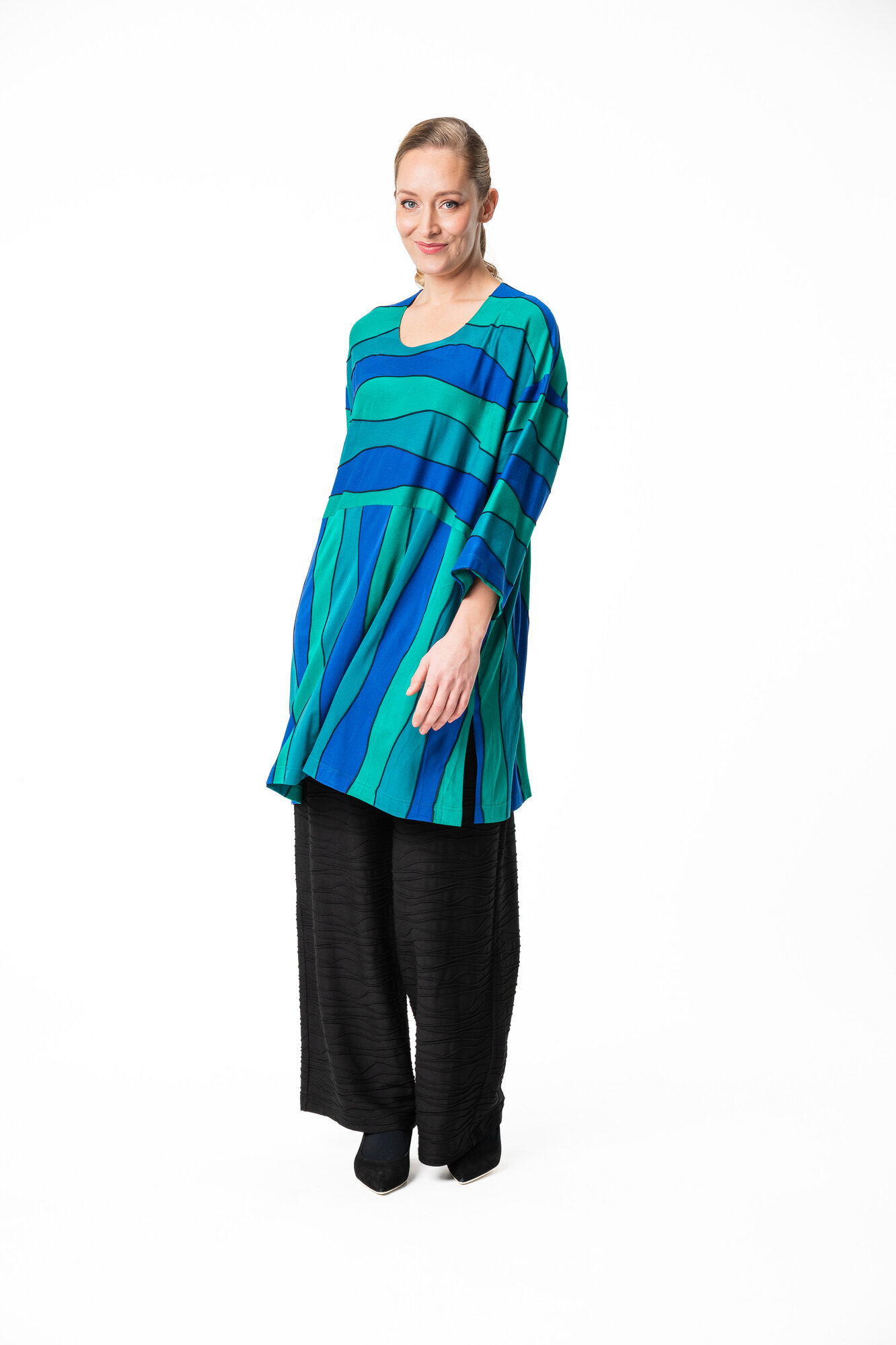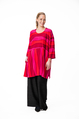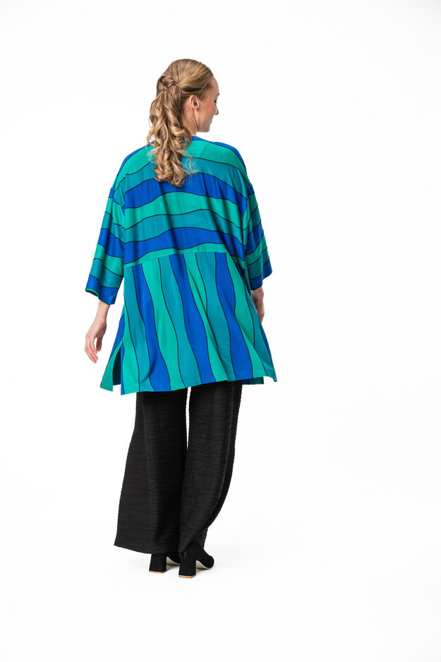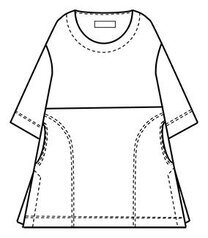 Desmona tunikassa on erittäin reilu ja rento mitoitus, laskettu olkalinja ja leveät 3/4 mittaiset hihat. Pääntie on pyöreä. Tunikan helmassa on väljyyttä tuovat halkiot molemmissa sivuissa. Sivusaumataskut.