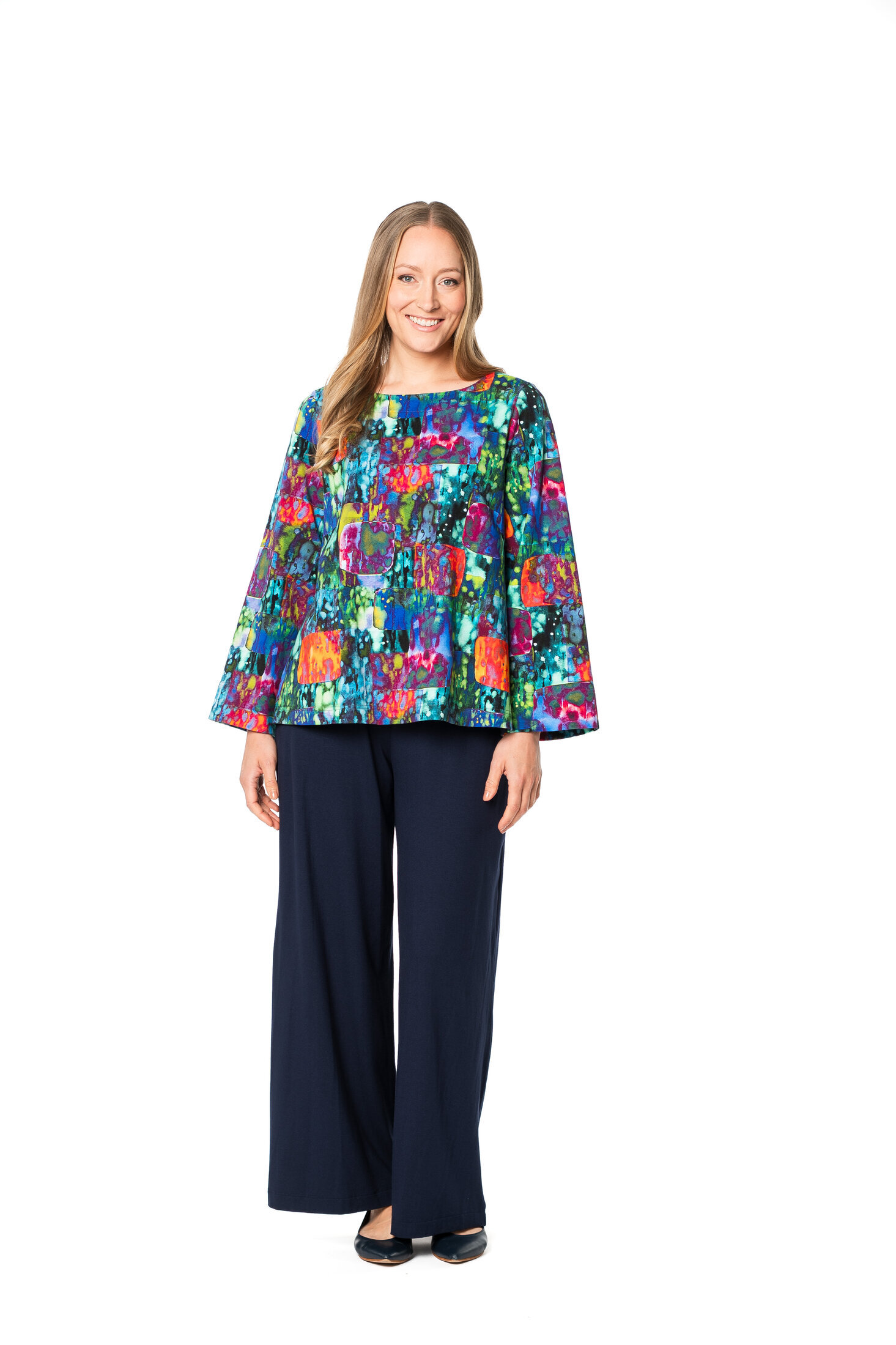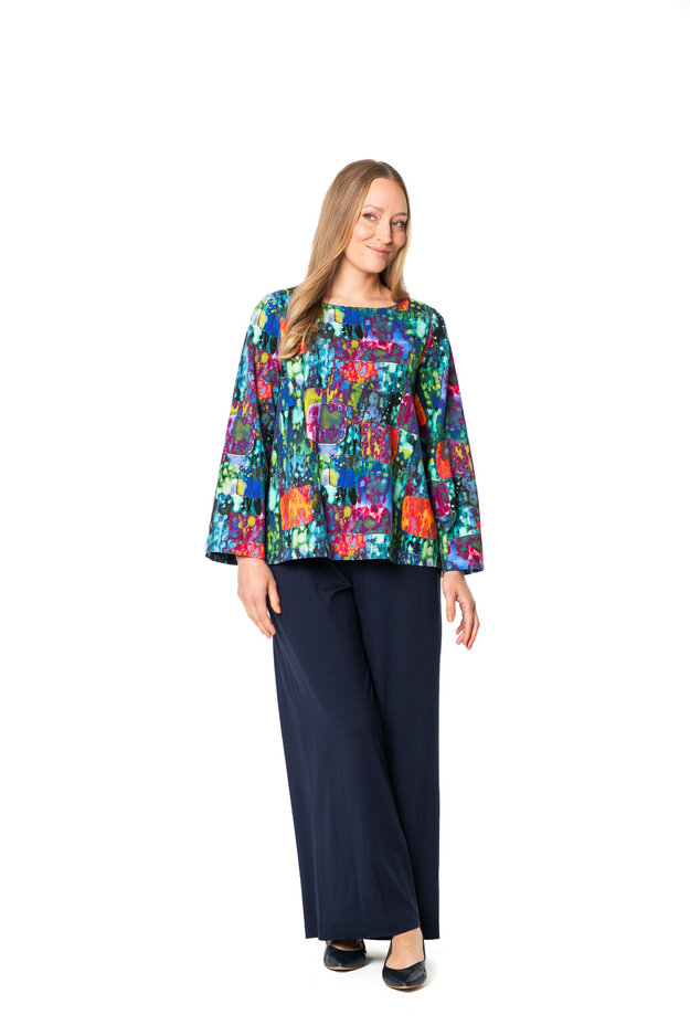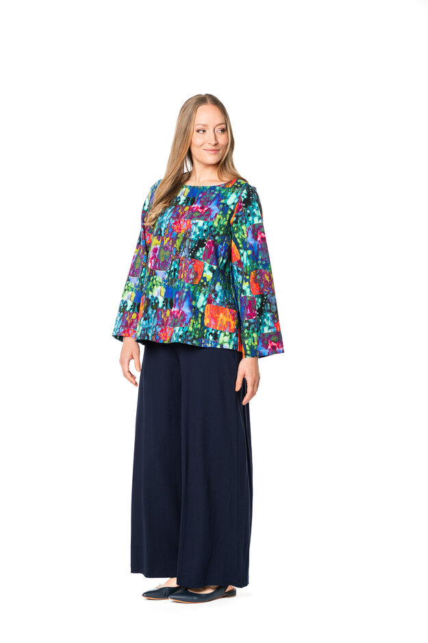 Jane on lyhyt pusero, jossa on leveät pitkät hihat. Tyylikäs pusero pyöreällä pääntiellä.