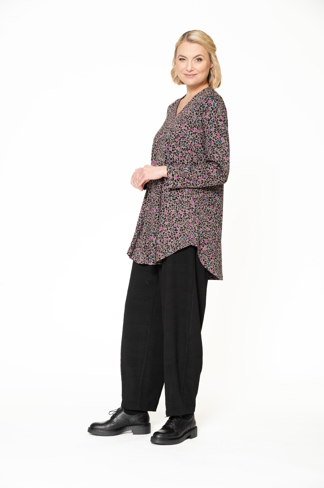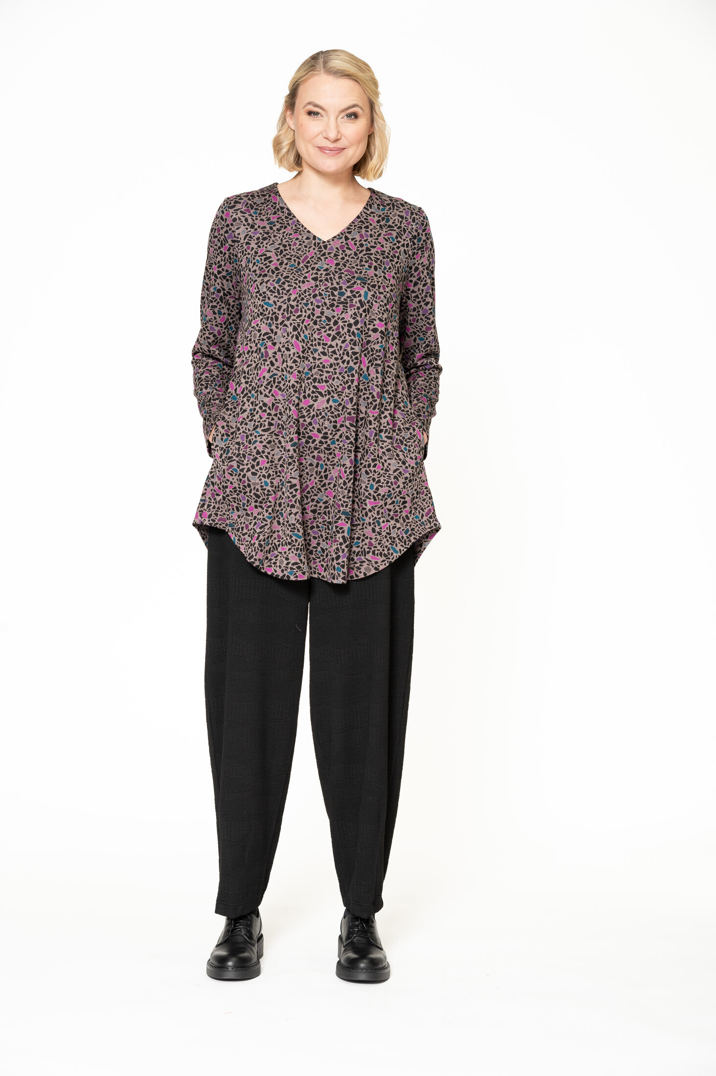 Pepi -tunikassa on V-kaula-aukko, pyöristetty helma ja erinomainen istuvuus rintavammille naisille.